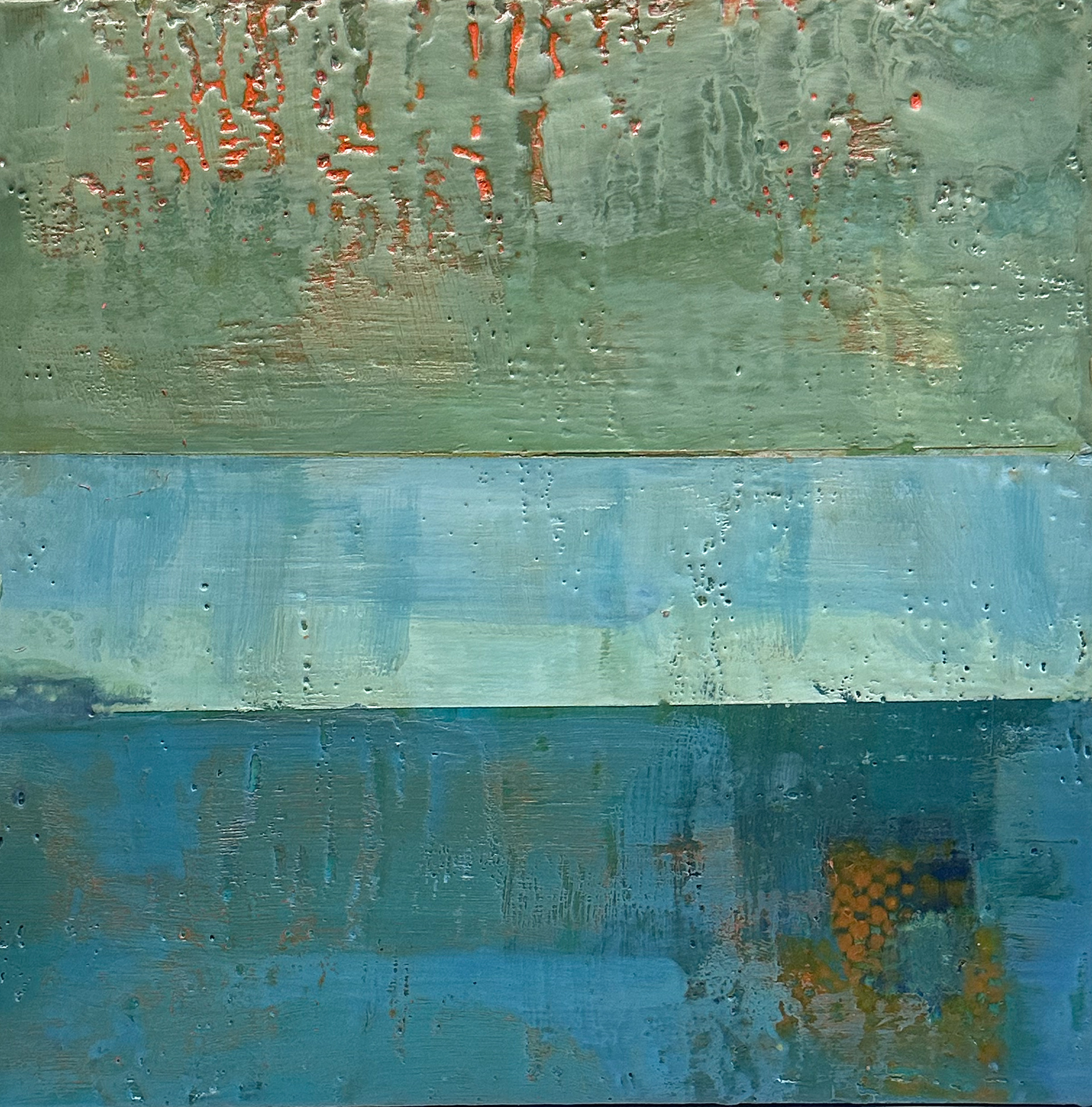Encaustic painting is a technique that involves using heated beeswax to which colored pigments are added. The heated wax is then applied to a surface of prepared wood & layers of wax are built up. Over time the wax will cure to a hard finish which is completely archival.
